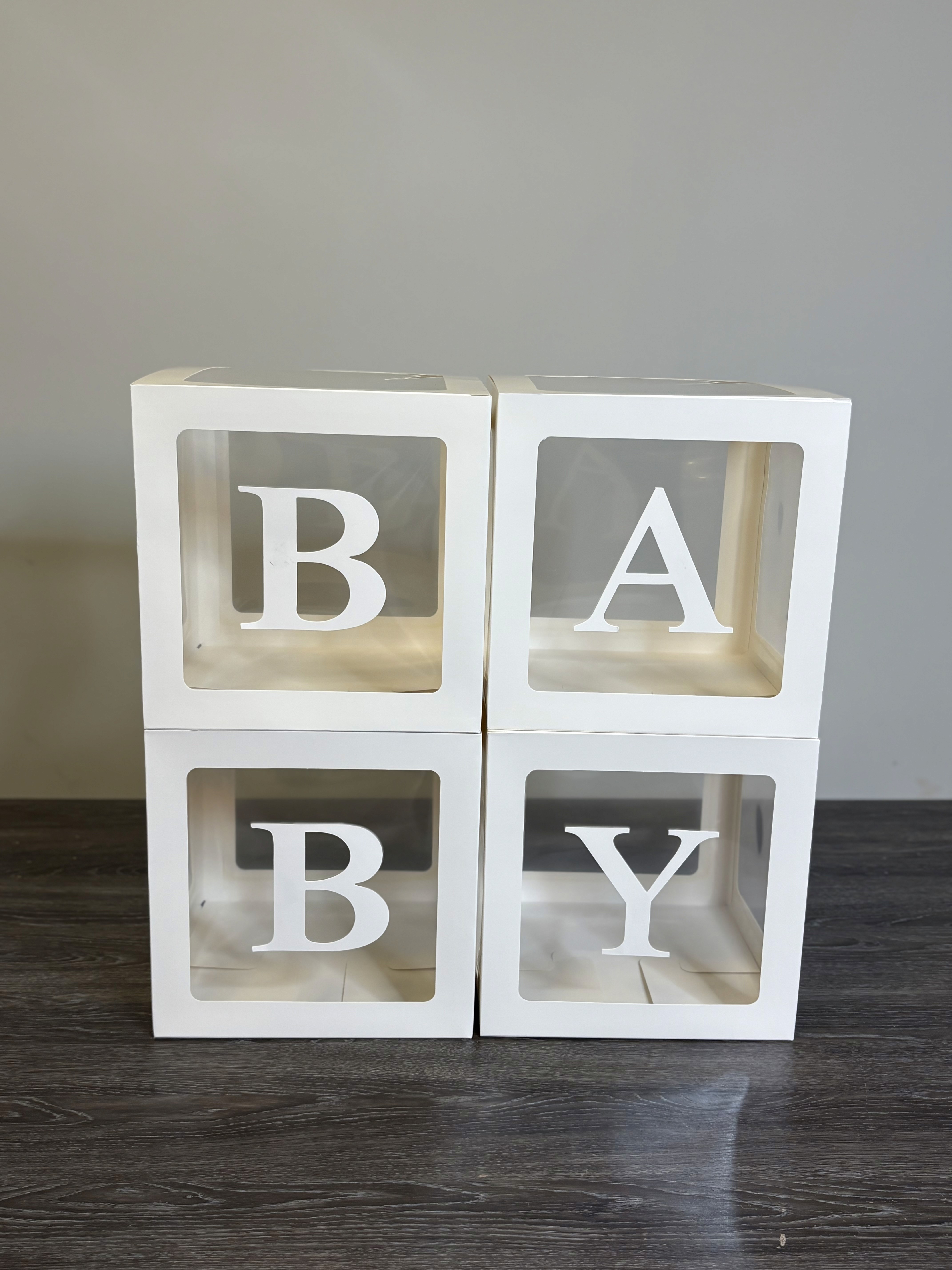 Included in this set are 4 boxes spelling out the word "Baby." Each box includes balloons inside. Each box measures 9.84” by 9.84”